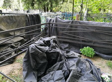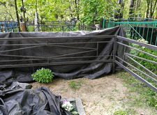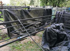 На фотографиях видно, как мы готовим оградку к покраске. Перед началом проведения работ мы обязательно укрываем плотной тканью как участок клиента, так и окружающие его места захоронения, чтобы случайно попавшая на памятники краска не создавала лишних проблем.